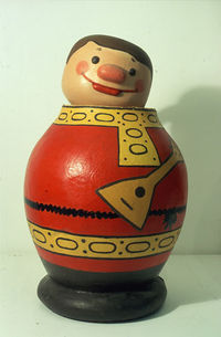 The first contact with the company was in 1990 when they brought their production of The Gingerbread Boy. The puppets are made from papier-mache and inspired by the design of Russian matryoshka dolls and Russian folk art. There are two versions of kolobok (the gingerbread boy), his grandparents, a bear, a fox, a wolf, a frog and two musicians. They have moving heads and mouths and are handheld in performance and operated by puppeteers dressed in black wearing black hoods.